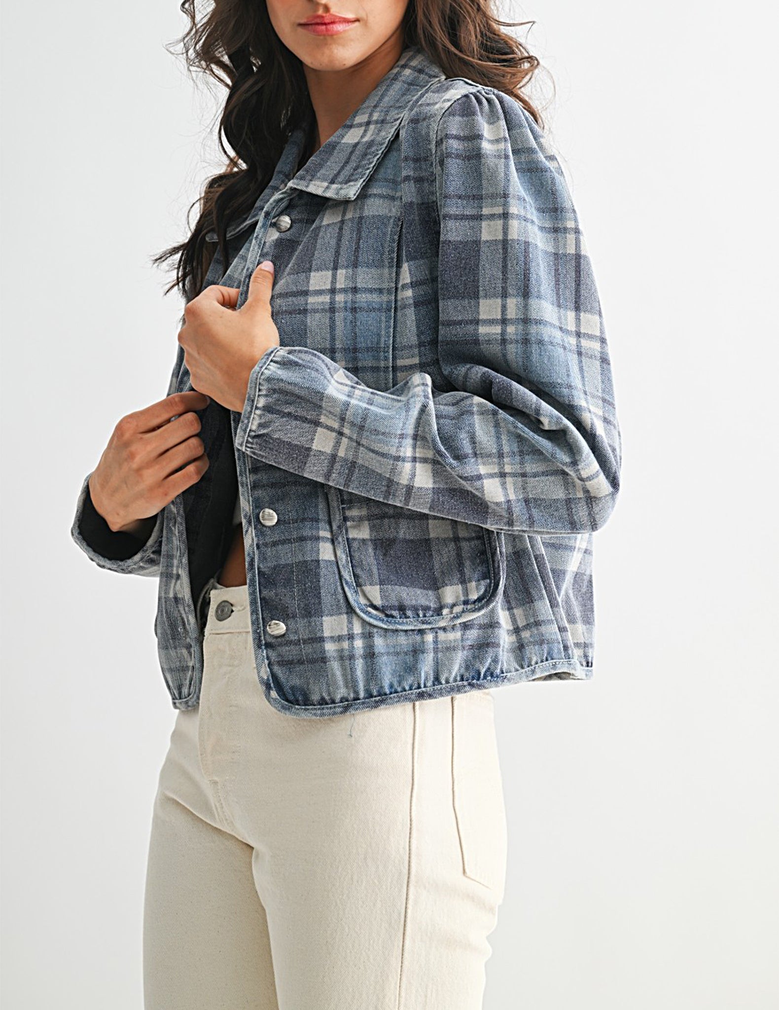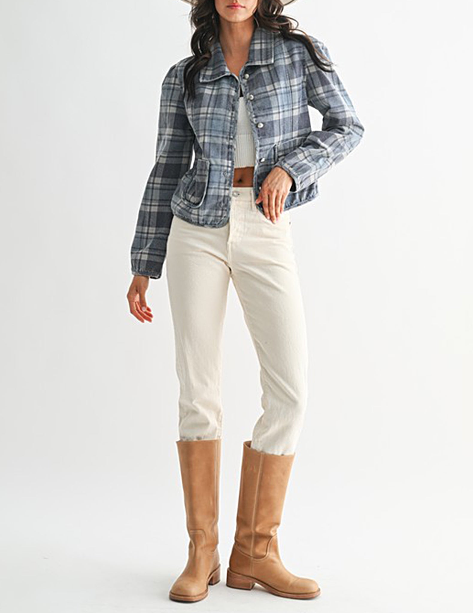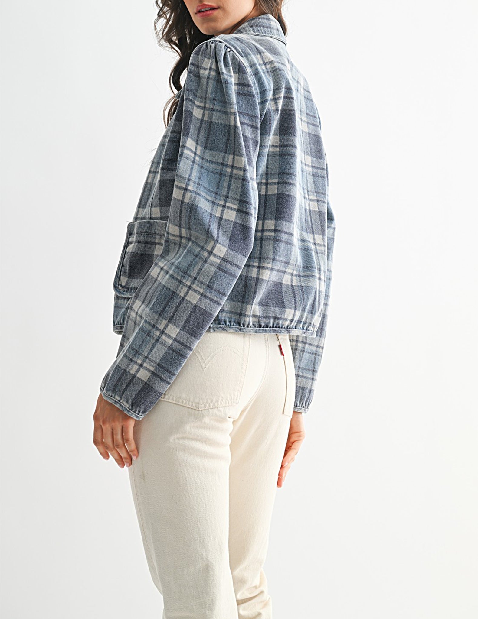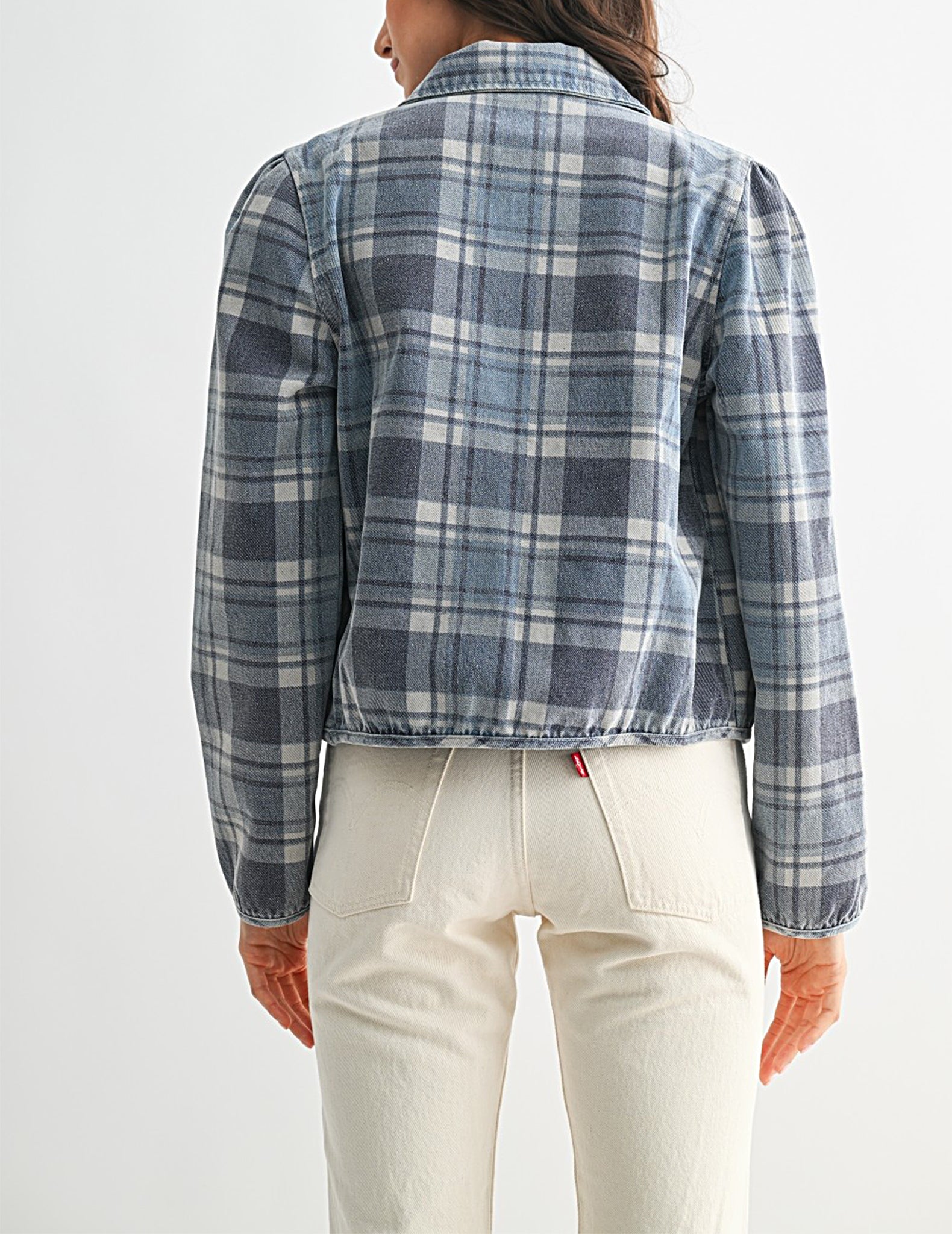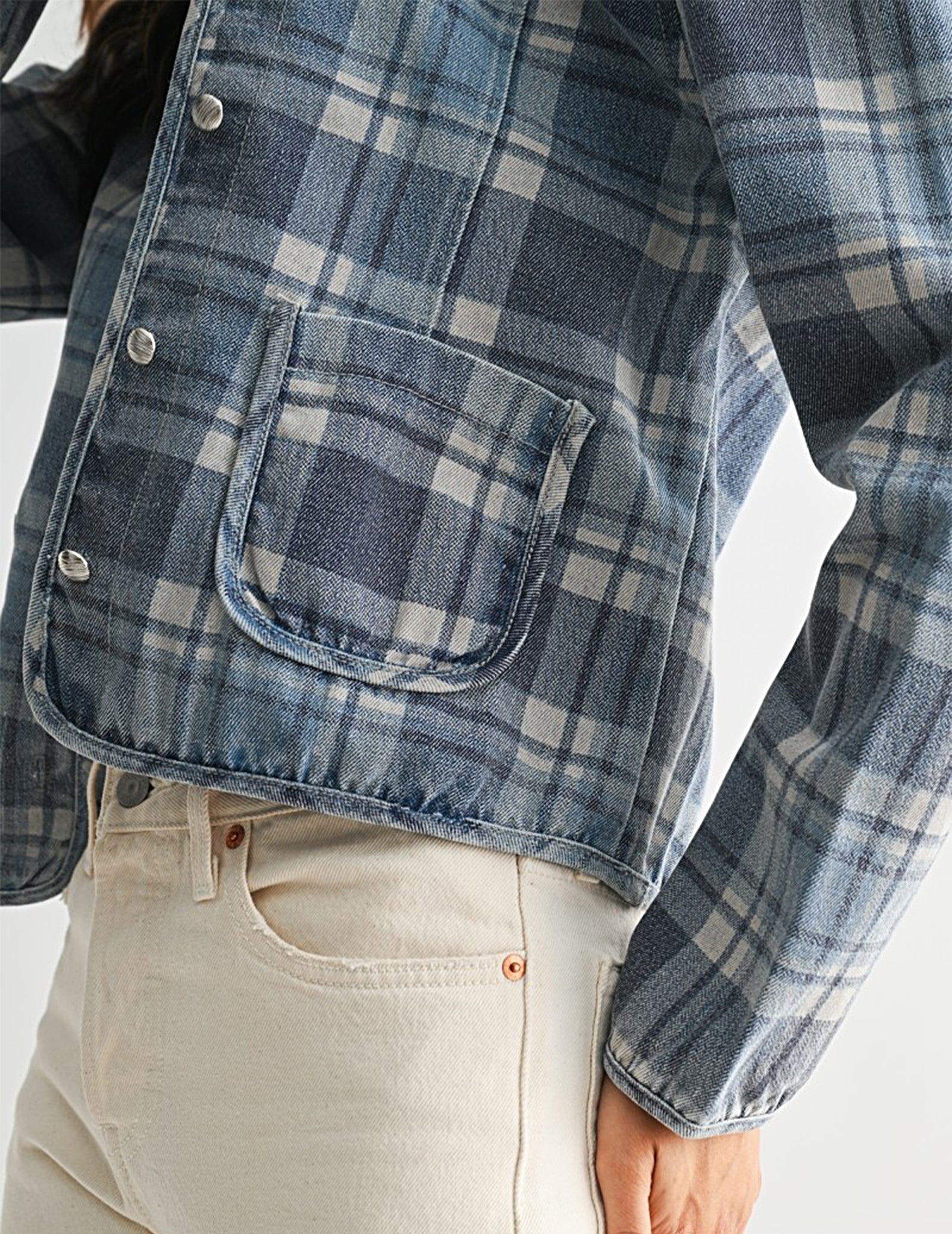 Denim inspired by blazer trends, the Liv is perfectly pre-softened in a weighted + washed blue denim plaid against a boxy, hip-grazing shape. Finished with patch pockets, puffed shoulders, and welt-seamed edges, pair this elevated denim jacket with white trousers and flats, or try a slim pencil skirt and heeled booties.