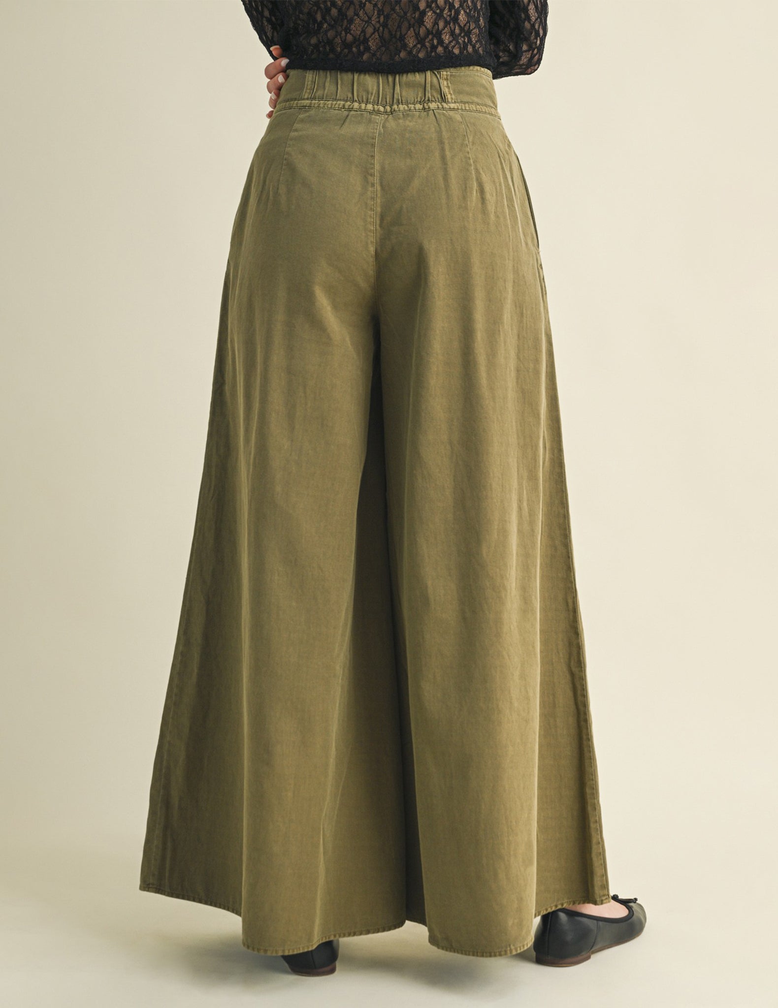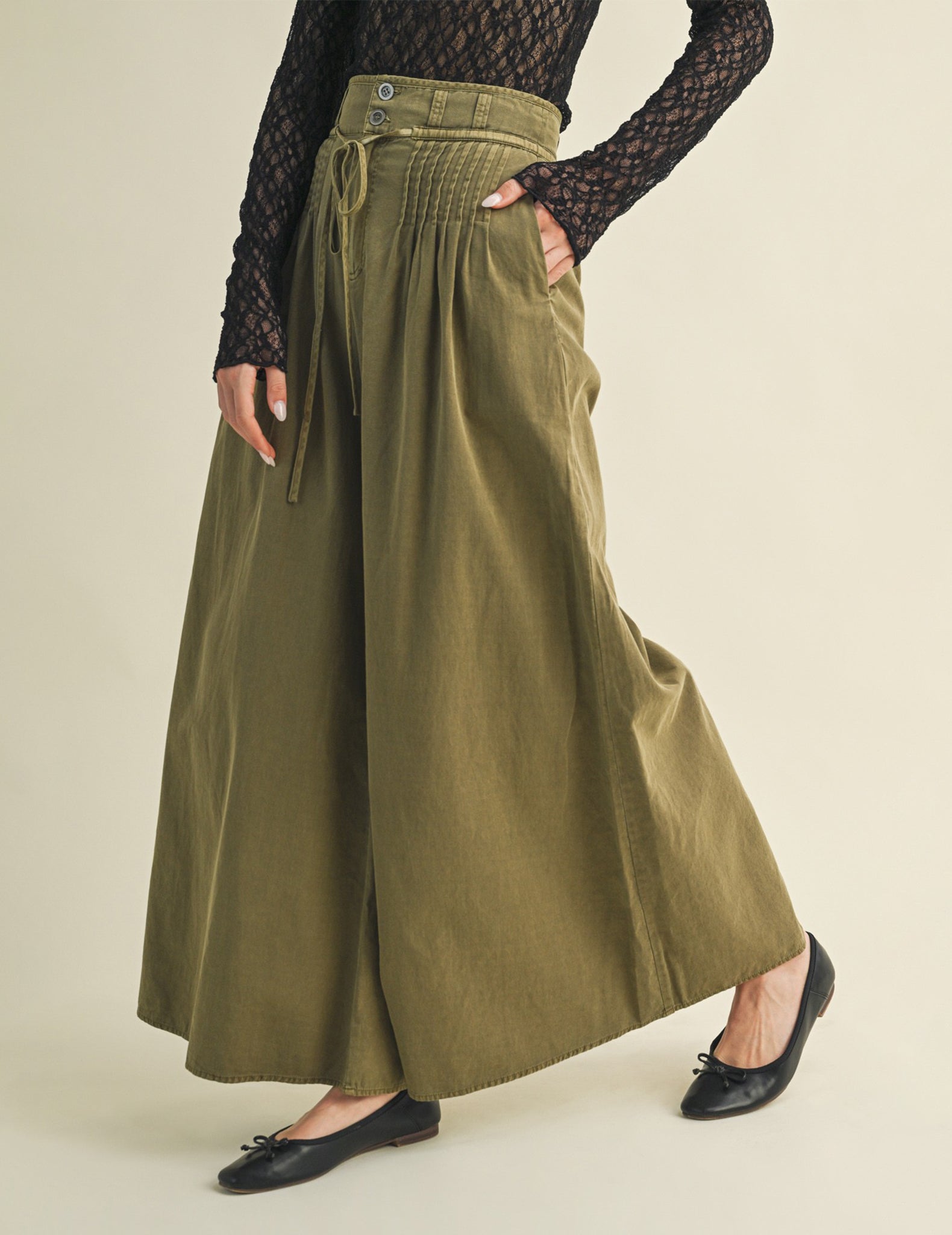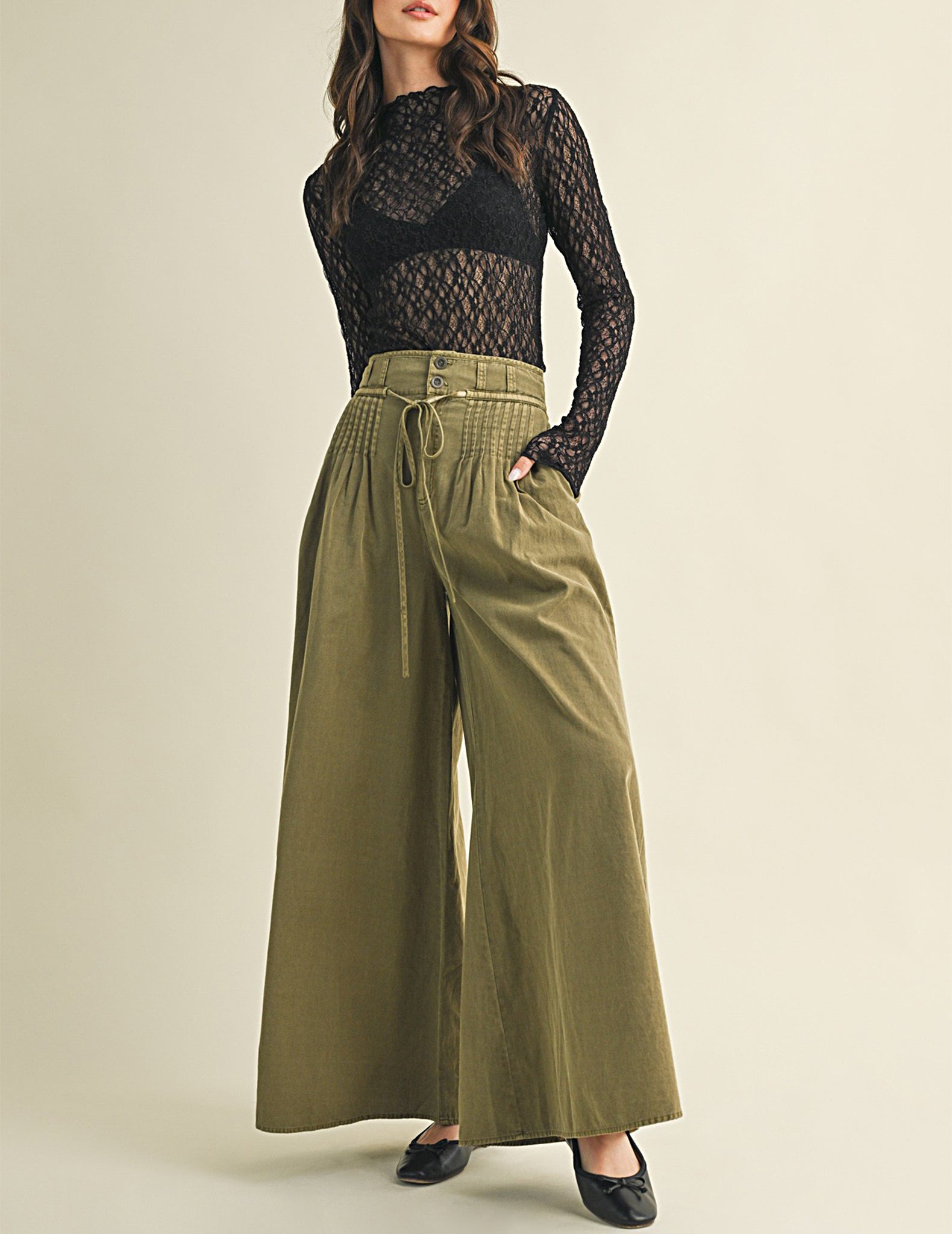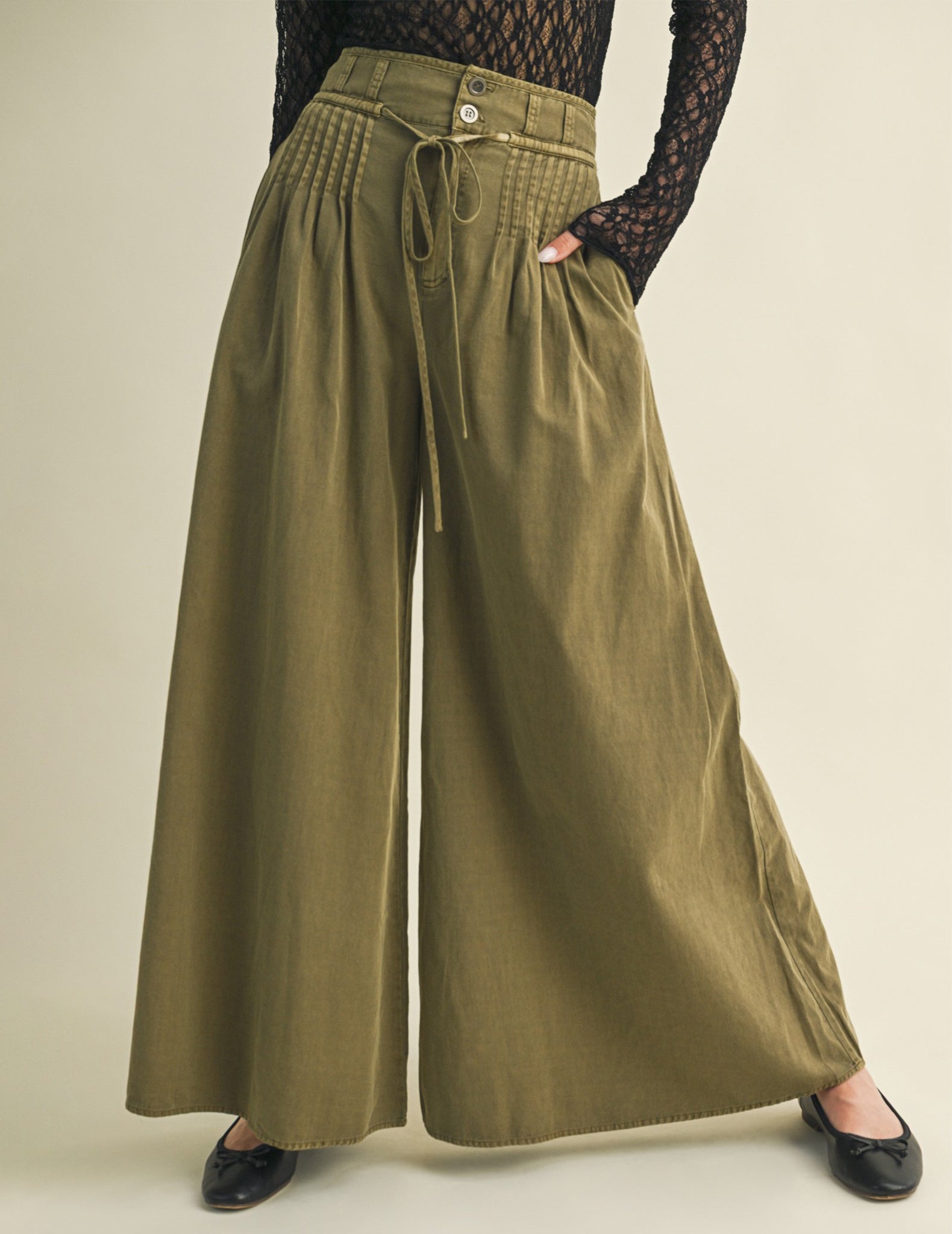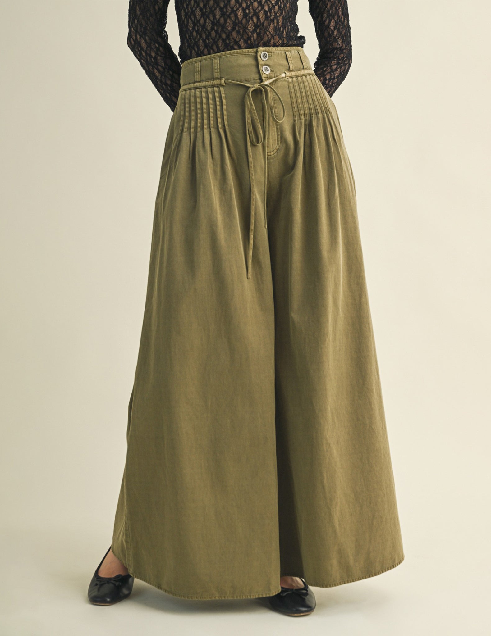 Soft yet structured in a washed, olive green canvas, these pants add fresh shape and texture to your fall closet. With unique, pintuck pleating and a drawn tie finish at the high-rise waistline, the Nora pants billow in an exaggerated, wide-leg silhouette. Finish these eye-catching pants with a cropped sweater and flats, or try a slim turtleneck, heeled boots.