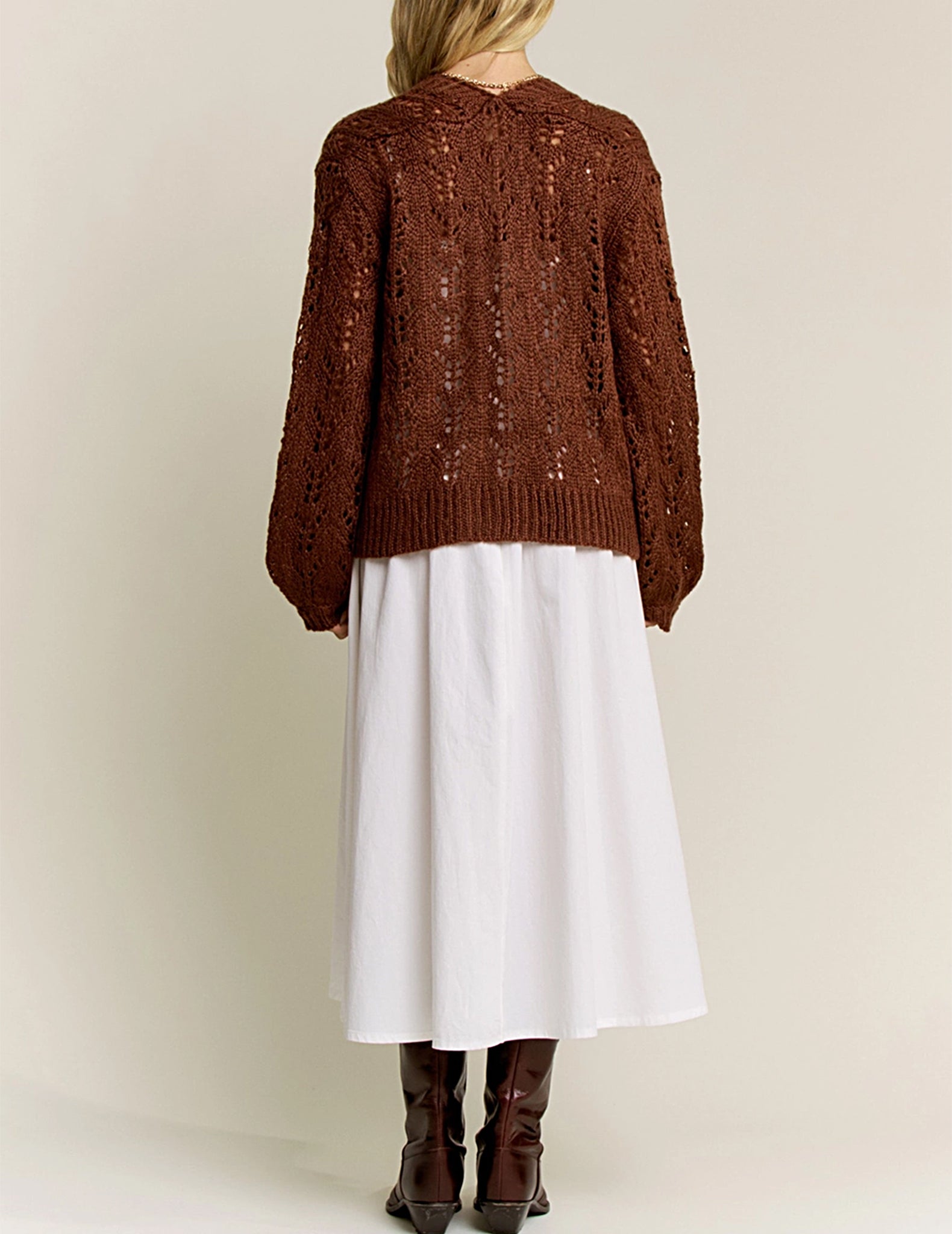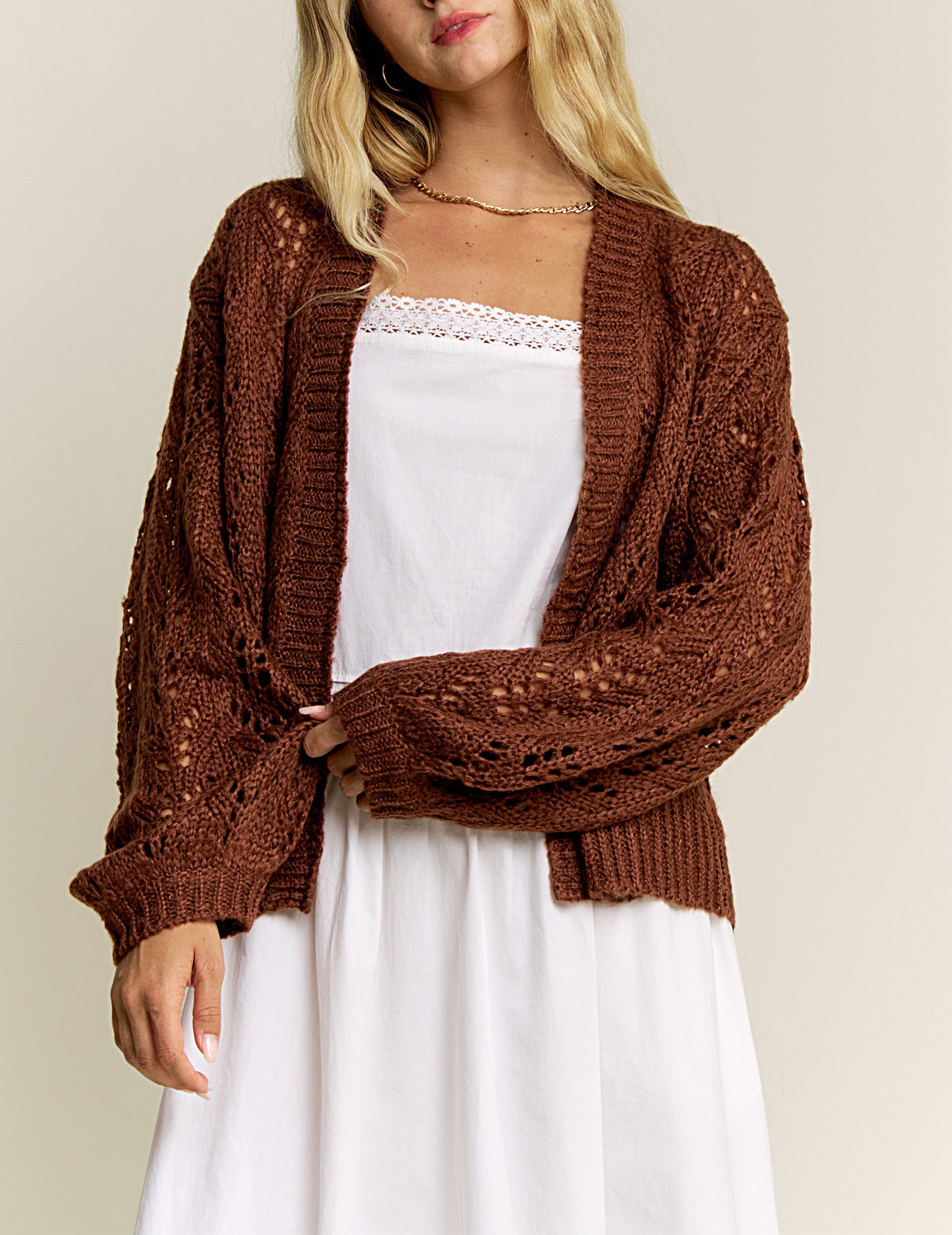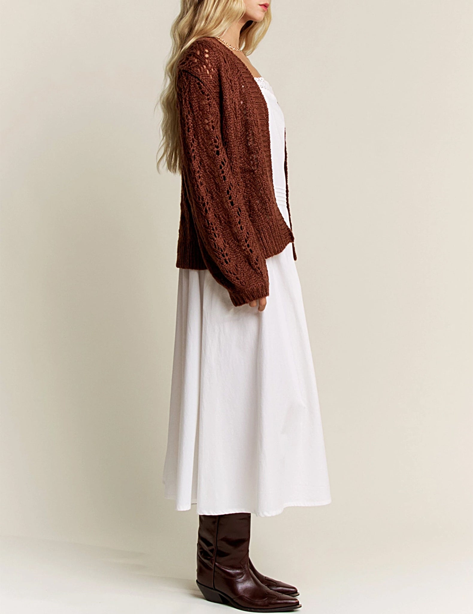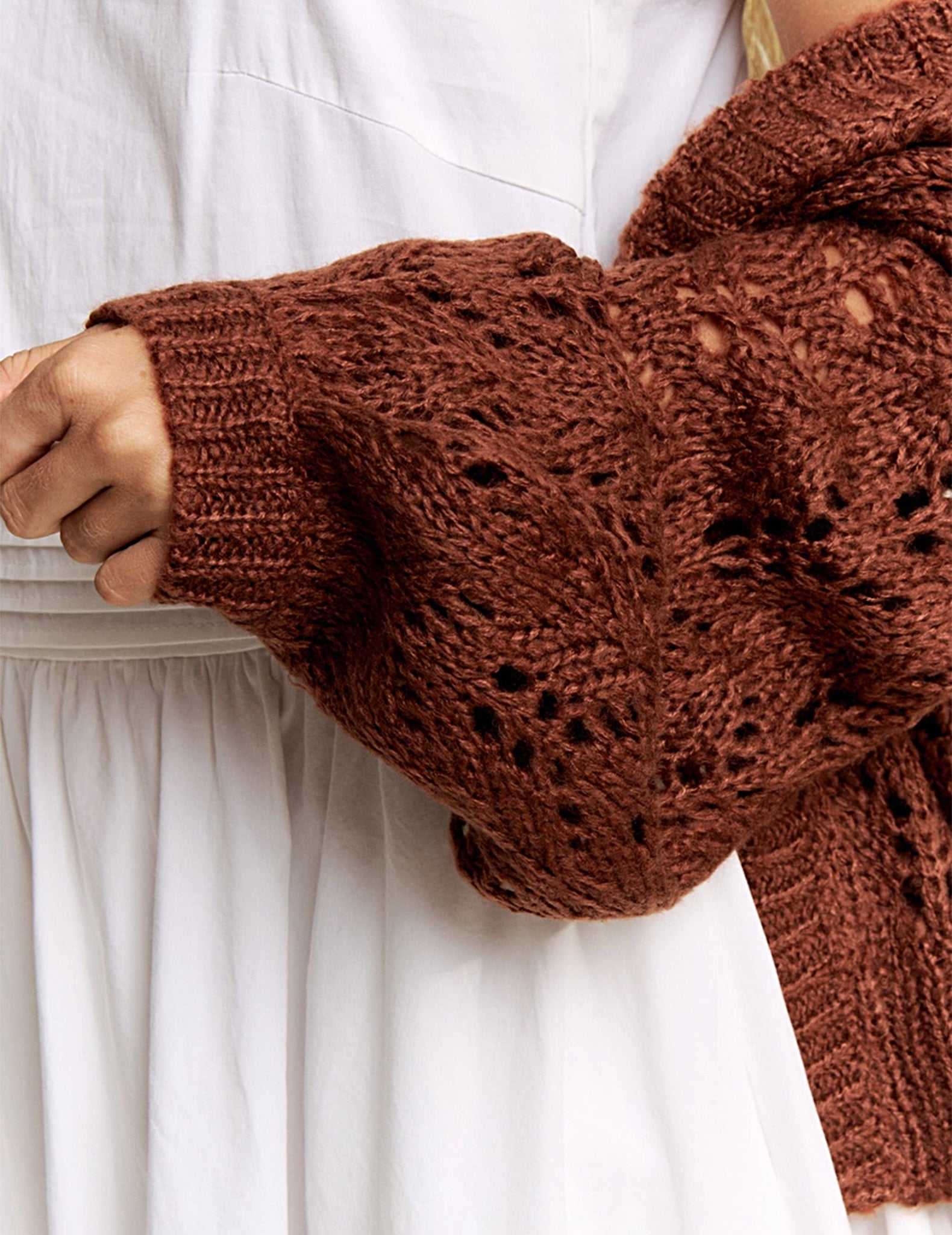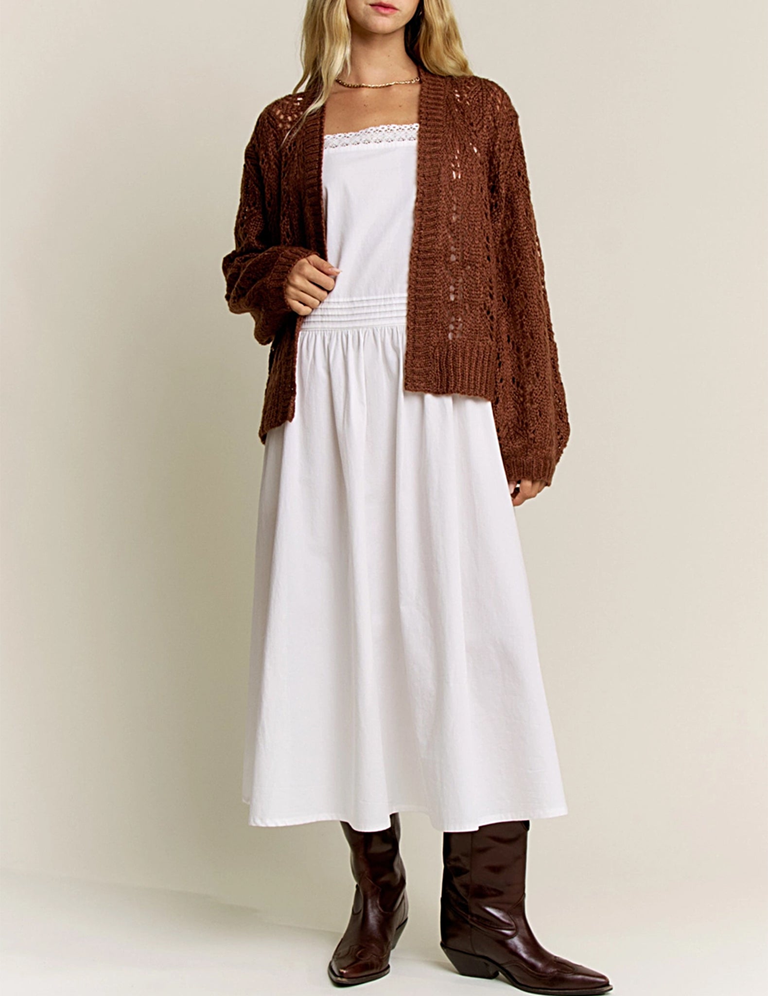 Soft and slouchy in an always-open hip-length cardigan, Robin’s crochet knit makes it a pretty top layer over dresses and tanks. It’s versatile in a rich, burlwood brown, with ribbed trim along the front, hem, and sleeve cuffs. Try it with denim or structured linen trousers, or top off a strapless dress to highlight the semi-sheer, peekaboo nature of the open crochet knit.
